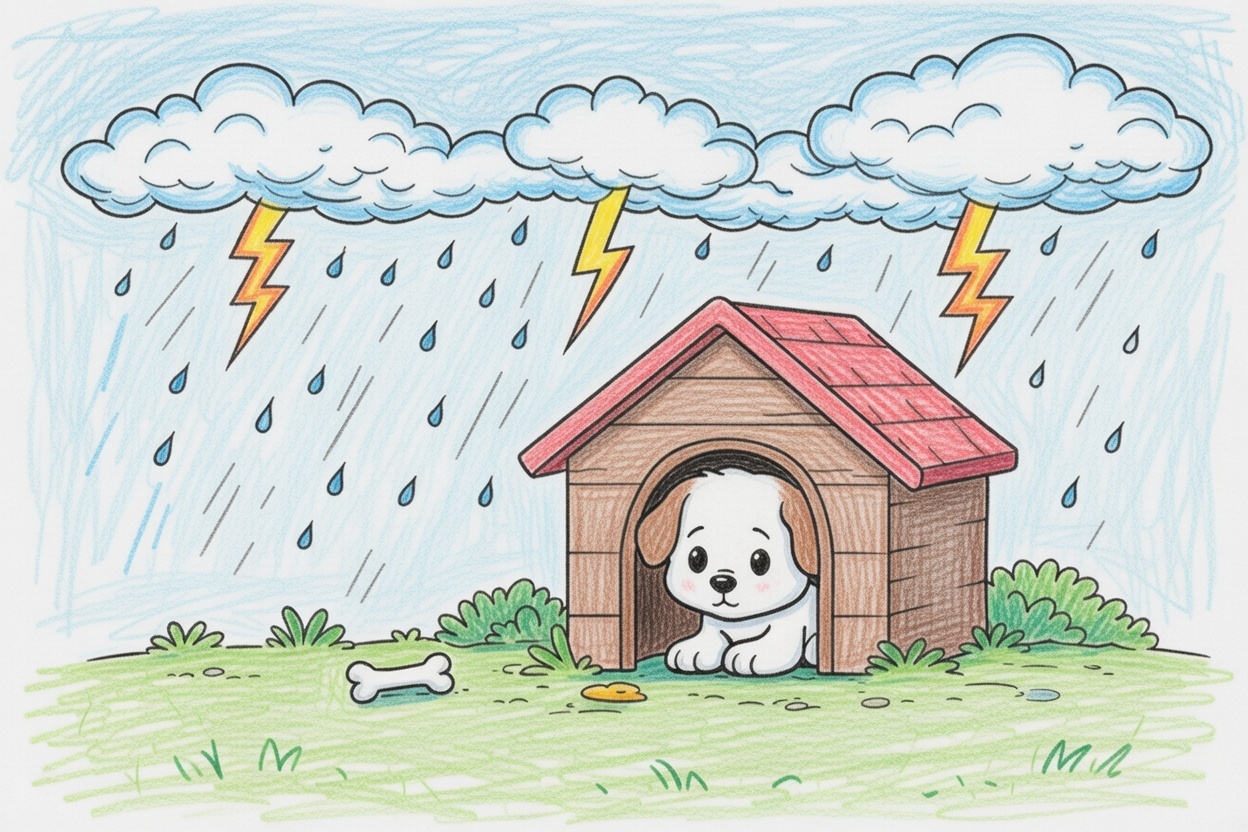 A printable coloring page showing a little puppy hiding in its doghouse during a strong storm. Simple shapes and bold lines make it suitable for toddlers and preschool kids ages 1–5.