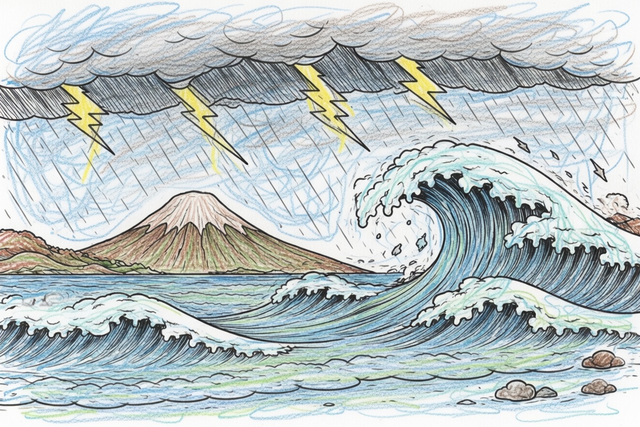 A simple printable coloring page for kids showing a stormy sea with big waves, rain, and lightning in a gentle Japanese-inspired style. Bold outlines and clear shapes make it suitable for ages 1–5.