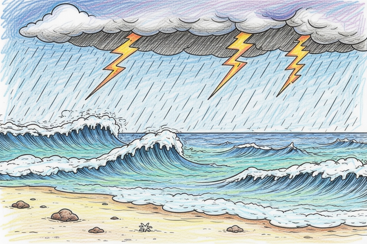 A dramatic printable coloring page for kids showing a strong storm over the sea with big waves, rain, and lightning. Bold lines and clear shapes make it suitable for preschool coloring.