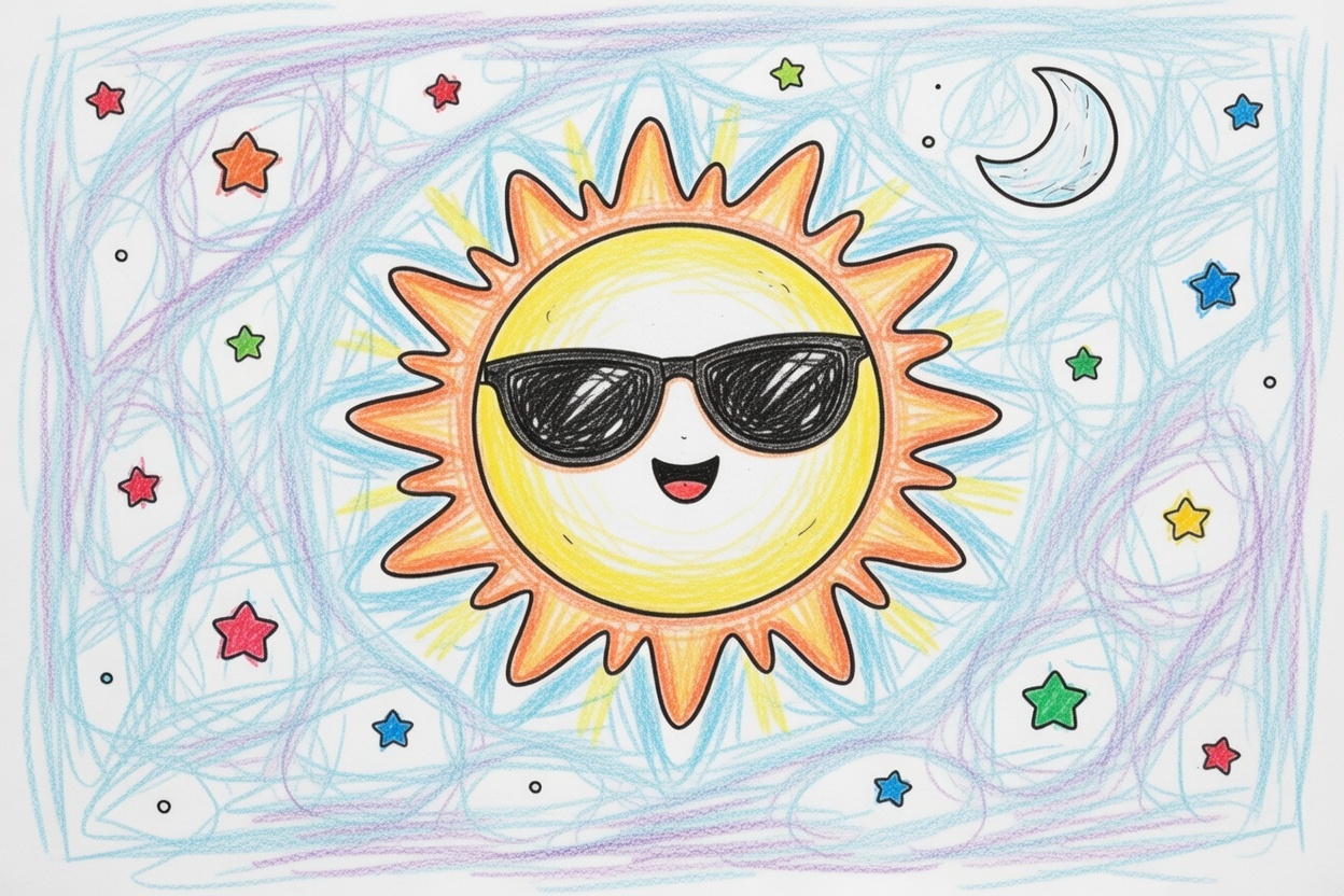 A fun printable coloring page for kids showing a smiling sun wearing sunglasses, with a moon and stars in the background. Big shapes and bold lines make it perfect for toddlers and preschoolers.