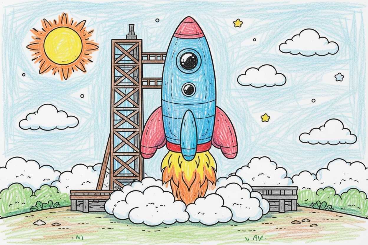 A beautiful printable coloring page for kids showing a detailed rocket standing on a launch pad, ready to take off. Bold outlines and clear shapes make it fun and easy to color.