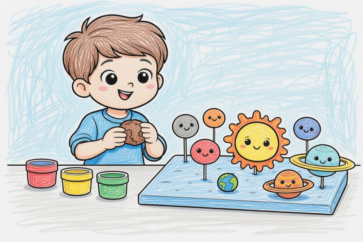 A printable coloring page showing a little boy making a simple solar system model from clay. Big friendly shapes and clear lines make it perfect for toddlers and preschool kids ages 1–5.
