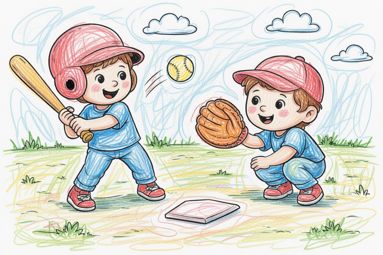 A fun printable coloring page for kids showing two boys playing baseball, with one hitting the ball and the other catching it with a glove. Big shapes and bold outlines make it easy to color.