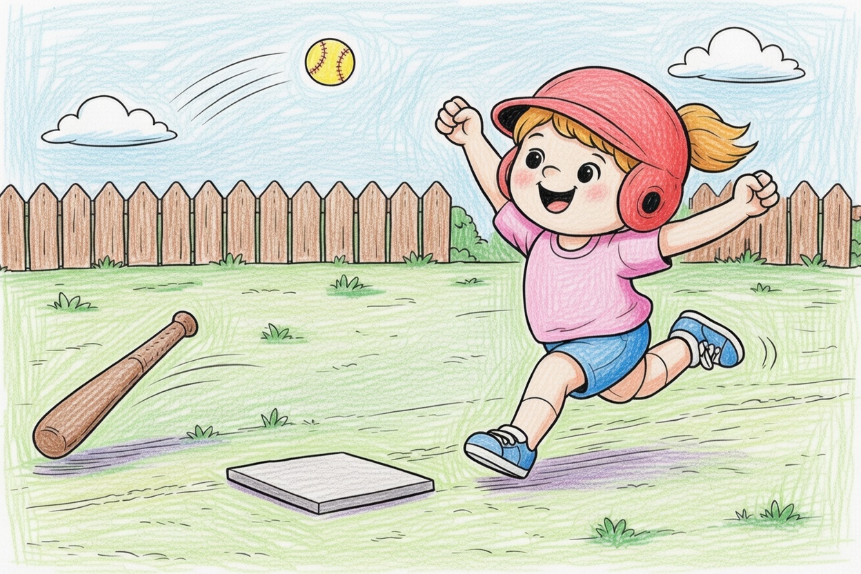 A fun printable coloring page for kids showing a happy girl running after hitting a home run in baseball. Big shapes and bold outlines make it easy and exciting to color for toddlers and preschoolers.