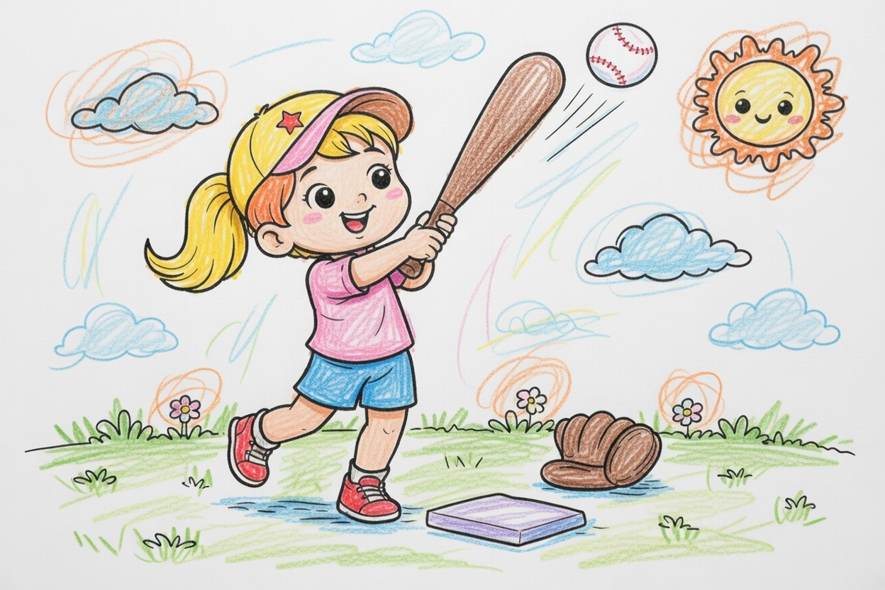 A printable coloring page showing a girl hitting a baseball high into the air. Simple bold black lines and clear shapes make it perfect for toddlers and preschool kids ages 1–5.