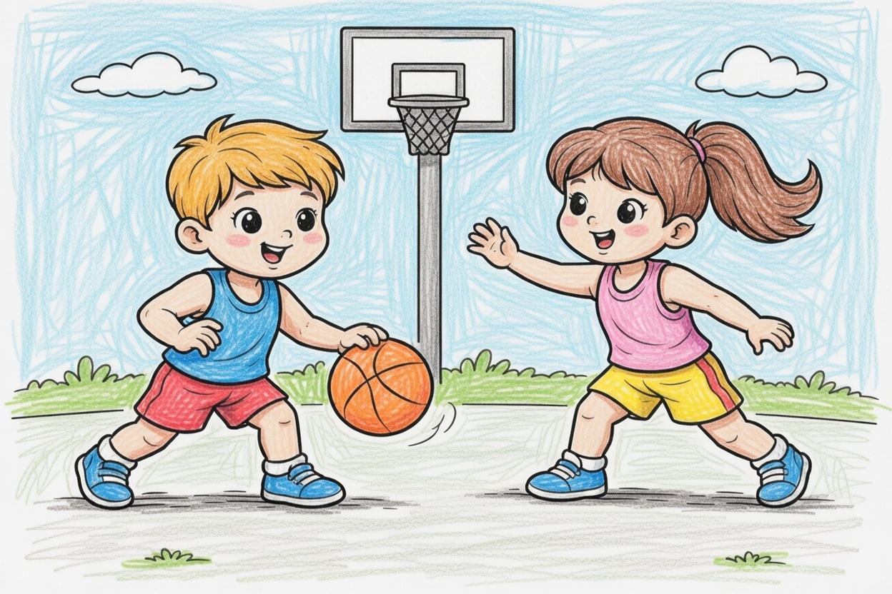 A printable coloring page showing a boy and a girl playing basketball together. Big simple shapes and bold black lines make it perfect for toddlers and preschool kids ages 1–5.