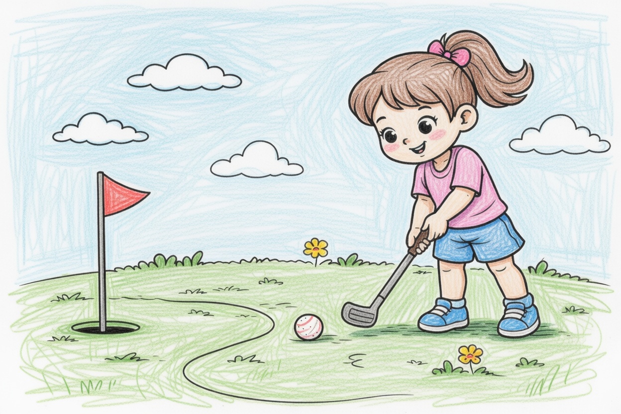 A printable coloring page showing a little girl playing kids’ golf with a club and ball near a hole. Simple bold black lines and big shapes make it perfect for toddlers and preschool kids ages 1–5.