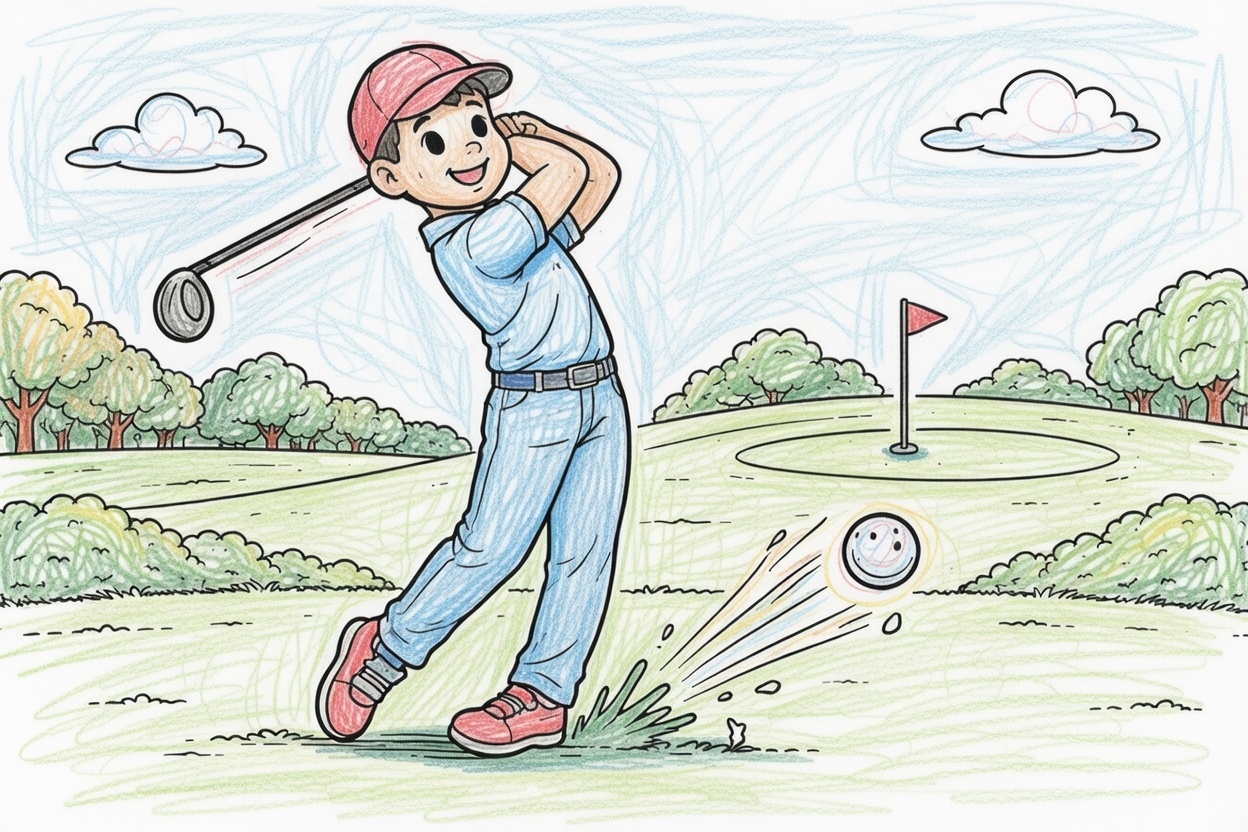 A fun printable coloring page for kids showing a professional golfer making a strong swing and hitting the golf ball far. Big shapes and bold black lines make it easy to color for toddlers and preschoolers.