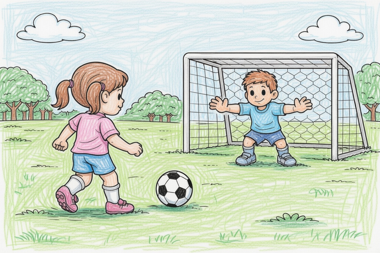 A fun printable coloring page for kids showing a girl getting ready to kick a penalty at a goalkeeper in the goal. Big shapes and bold black lines make it perfect for toddlers and preschoolers.