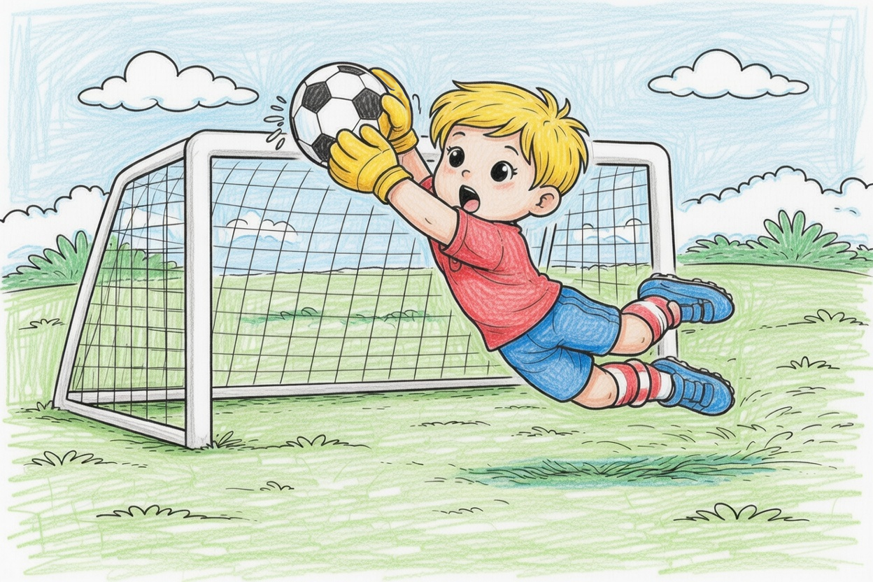A printable coloring page showing a goalkeeper jumping and catching a soccer ball flying into the goal. Big clear shapes and bold black lines make it perfect for toddlers and preschool kids ages 1–5.