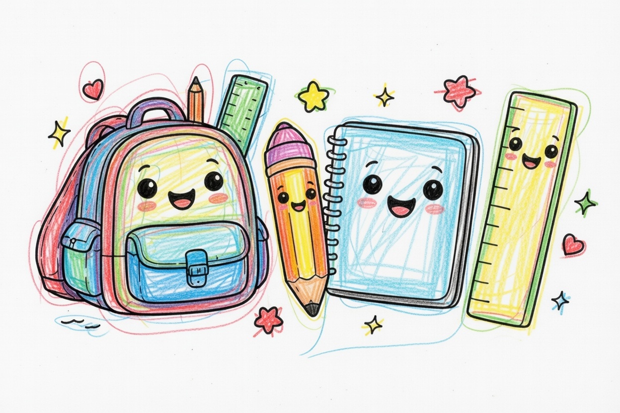 Meet happy school supplies come to life! A smiling backpack, pencil, notebook, and ruler enjoy a fun moment together. This simple coloring page is perfect for little kids to explore colors and practice easy shapes.
