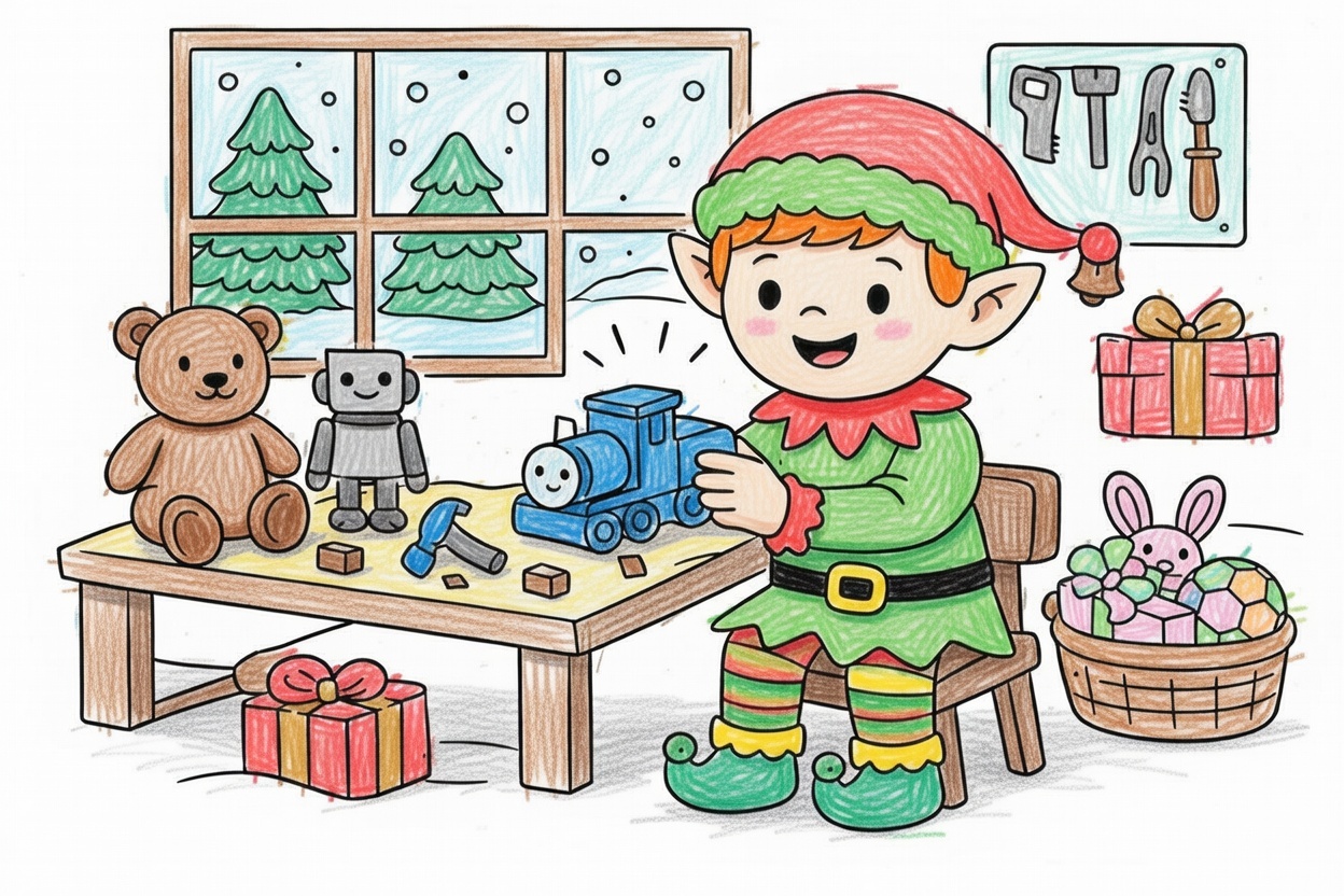Meet a busy little elf making toys at a workbench! Big, simple shapes make this page perfect for ages 1–5, helping kids enjoy holiday coloring while practicing fine motor skills and focus.