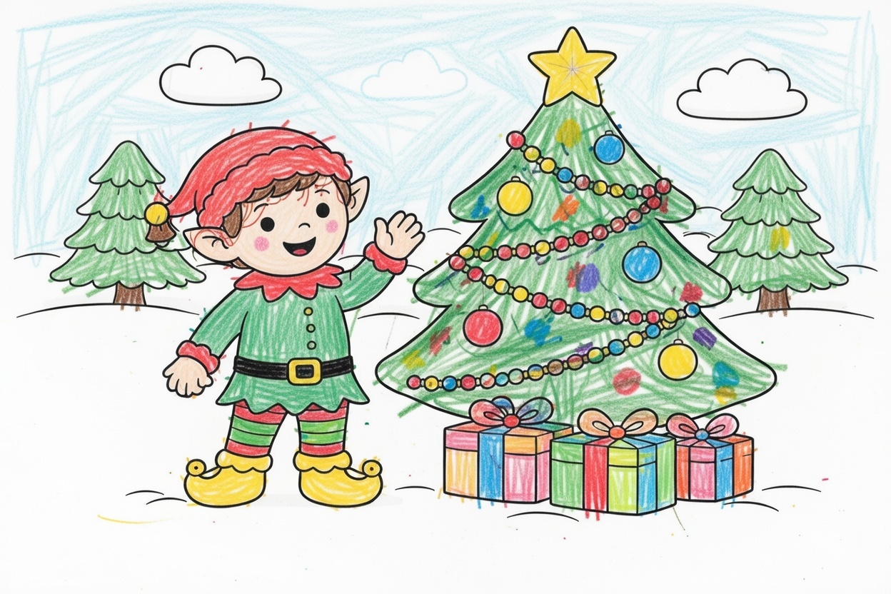 A happy little elf stands next to a Christmas tree and waves hello! Big, simple shapes make this coloring page perfect for ages 1–5 and great for practicing hand control during cozy holiday playtime.