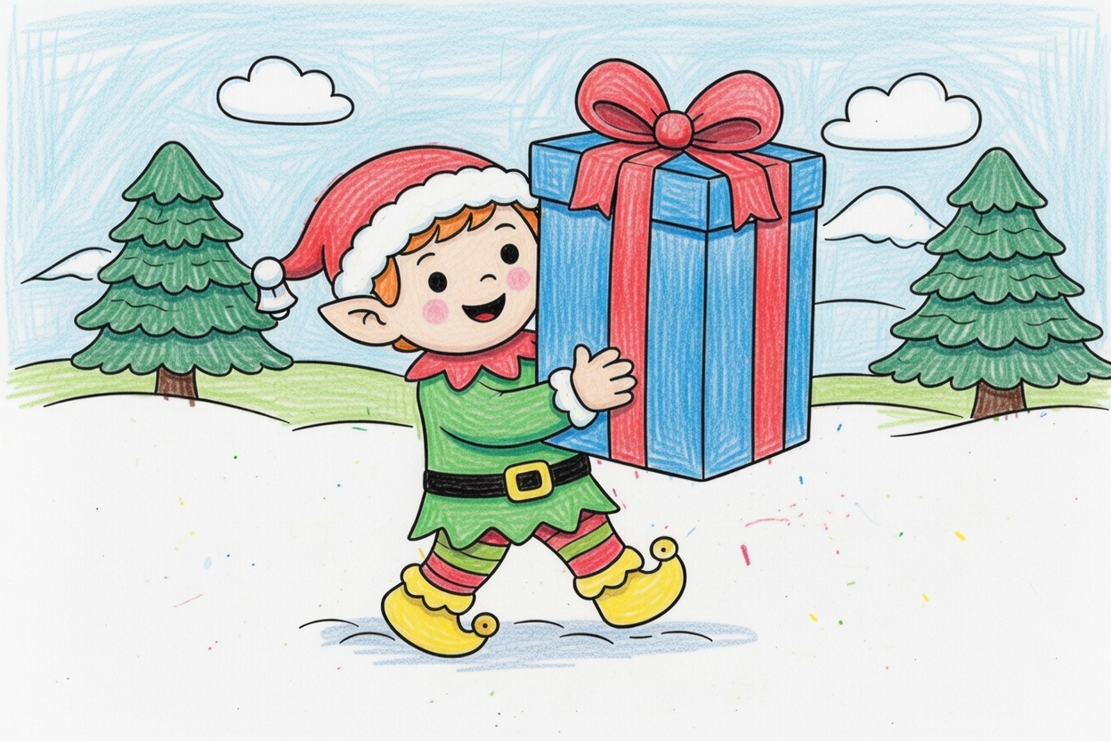 A friendly little elf holds a big gift almost as tall as he is! This coloring page uses simple lines and large shapes, making it perfect for ages 1–5 and easy holiday coloring fun.