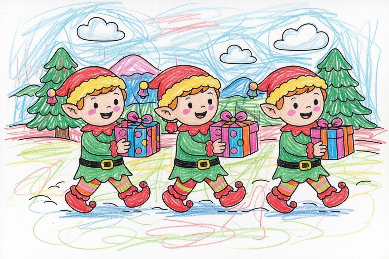 Three happy elves carry big presents through the snow! This simple coloring page has large, clear shapes for ages 1–5, making it easy to color and perfect for practicing hand control and holiday fun.