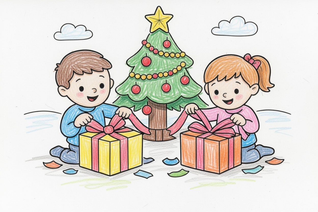Happy kids sit together and open big presents with smiles. This simple coloring page uses large, clear shapes, making it perfect for ages 1–5 and fun, stress-free holiday coloring time.