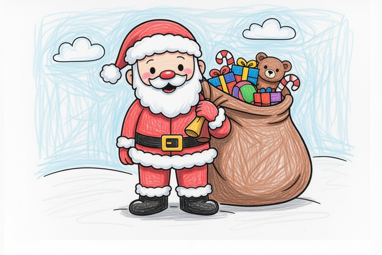 Santa stands with a big gift bag full of simple toys and candy. Large, clean shapes and bold lines make this coloring page perfect for ages 1–5 and easy, cozy holiday coloring fun.
