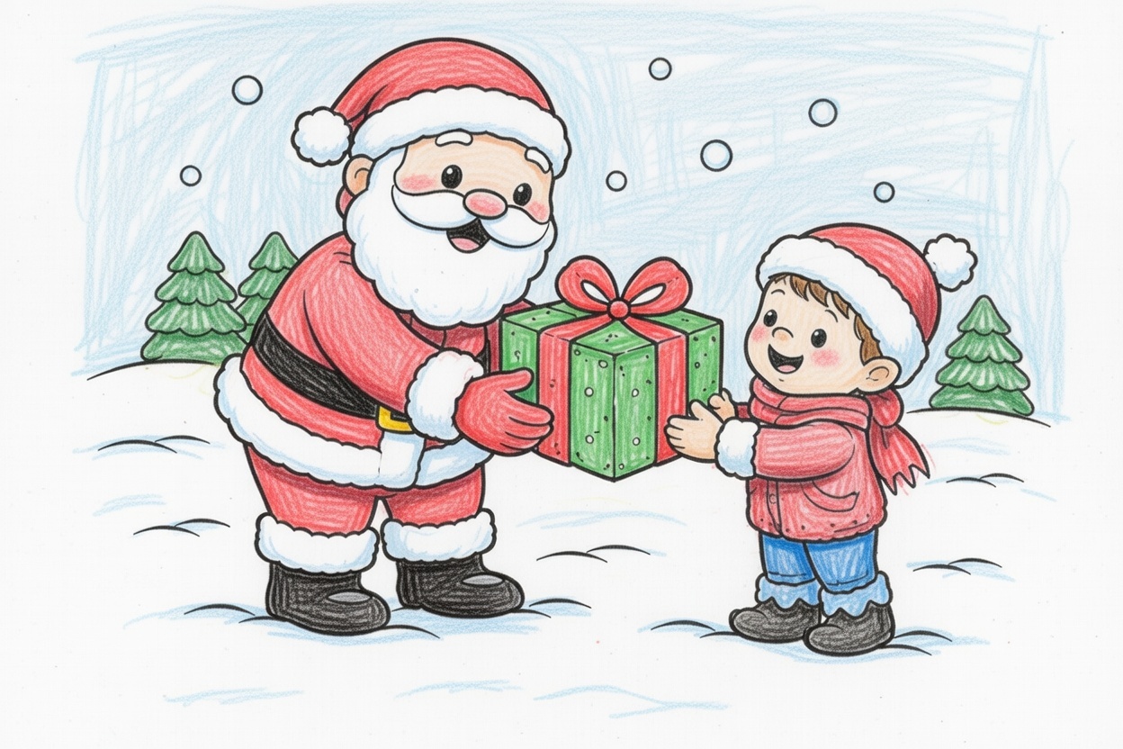 Santa smiles as he gives a big present to a happy child. Large shapes, clean bold lines, and minimal details make this coloring page perfect for ages 1–5 and easy, joyful Christmas coloring.