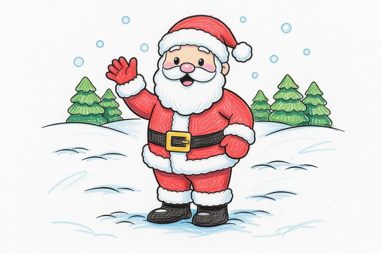 A friendly Santa stands in the snow and waves hello with a big smile. Bold, simple lines and large shapes make this coloring page perfect for ages 1–5 and easy Christmas coloring fun.