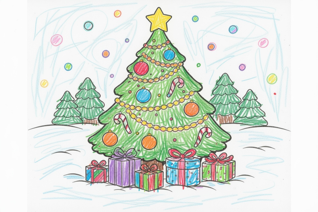 A big Christmas tree stands tall with simple ornaments and presents below. Large shapes, minimal details, and bold lines make this coloring page perfect for ages 1–5 and calm, joyful holiday coloring.