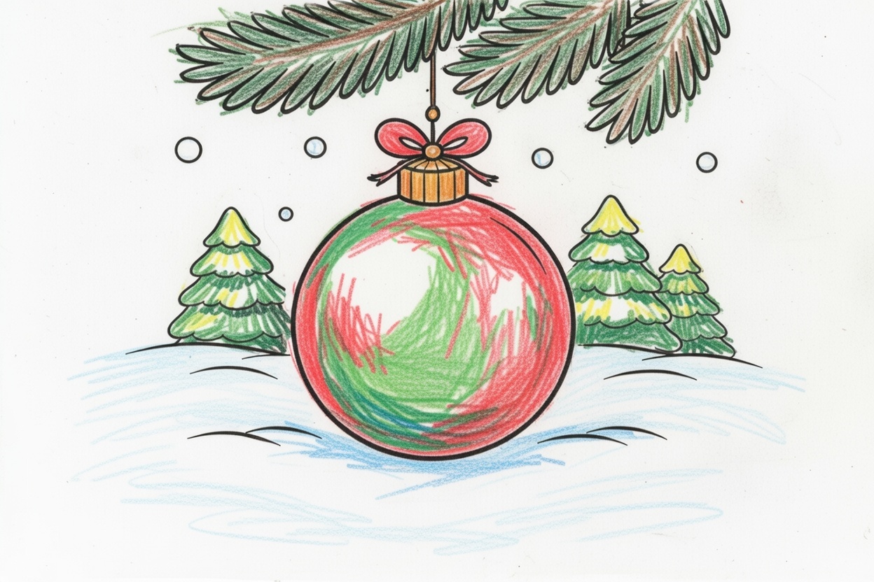A big Christmas ornament hangs from a tree branch and gently sways. Simple lines, large shapes, and minimal details make this coloring page perfect for ages 1–5 and calm holiday coloring.