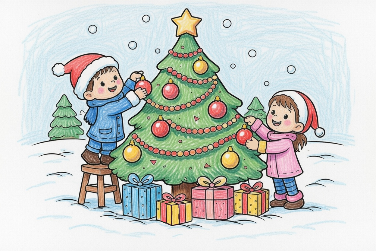 Happy kids decorate a Christmas tree with big ornaments and simple garlands. Large shapes, clean lines, and minimal details make this coloring page perfect for ages 1–5 and easy holiday fun.