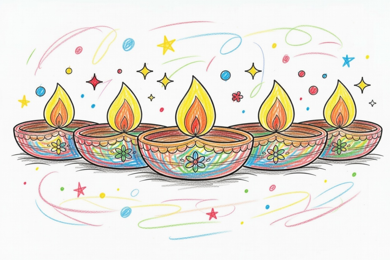 Several diya lamps are placed in a neat row, glowing softly together. Large shapes, simple lines, and minimal details make this coloring page perfect for ages 1–5 and calm, festive coloring.