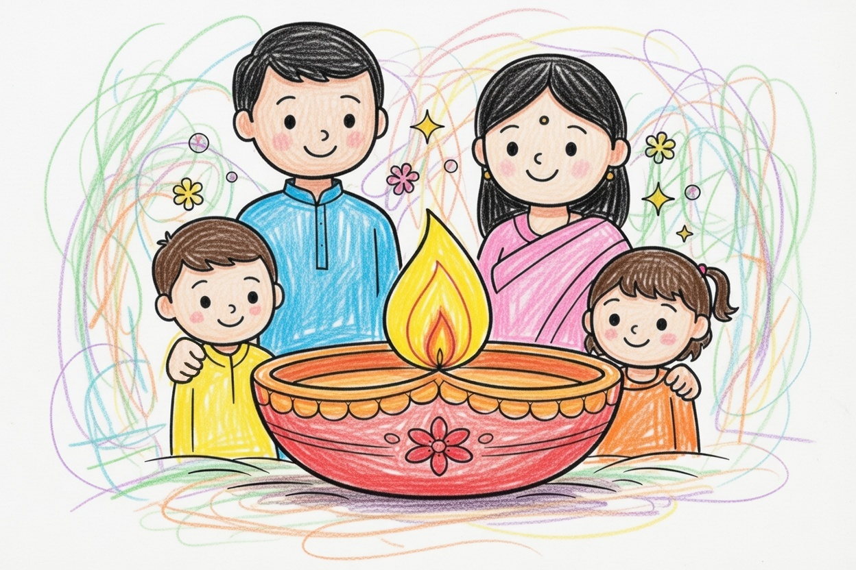 A happy family stands together with a big diya lamp between them. Large shapes, simple faces, and clean lines make this coloring page perfect for ages 1–5 and calm, festive coloring time.