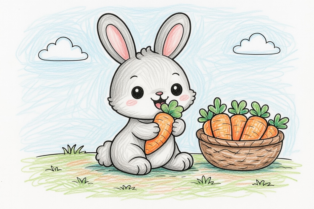 A cute bunny sits on the grass and happily eats a big carrot. Simple shapes, bold lines, and a light background make this coloring page perfect for ages 1–5 and easy, joyful coloring time.