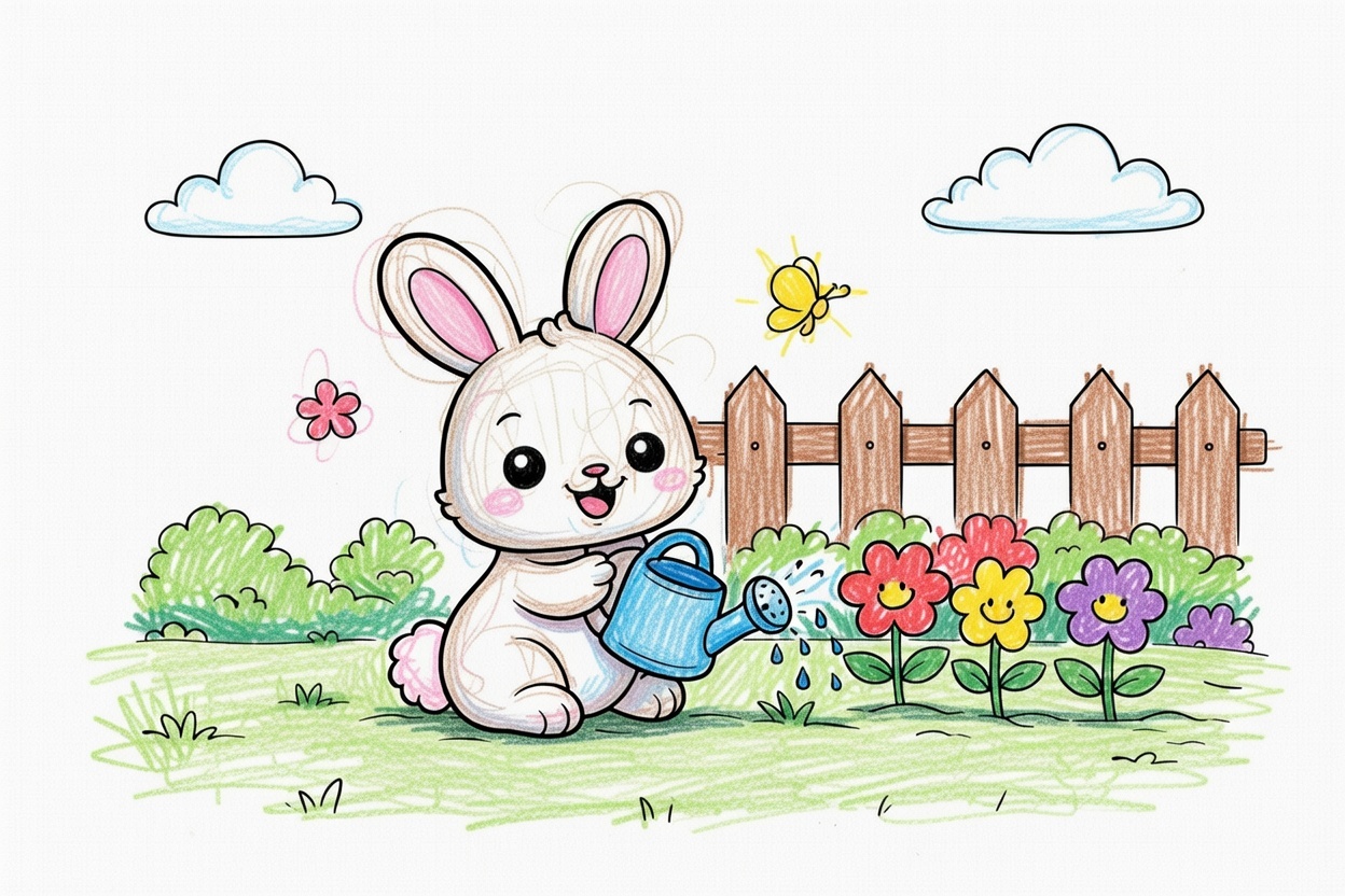 A happy bunny waters flowers in a simple garden. Big shapes, bold lines, and a light background make this coloring page perfect for ages 1–5 and easy, relaxing coloring time.