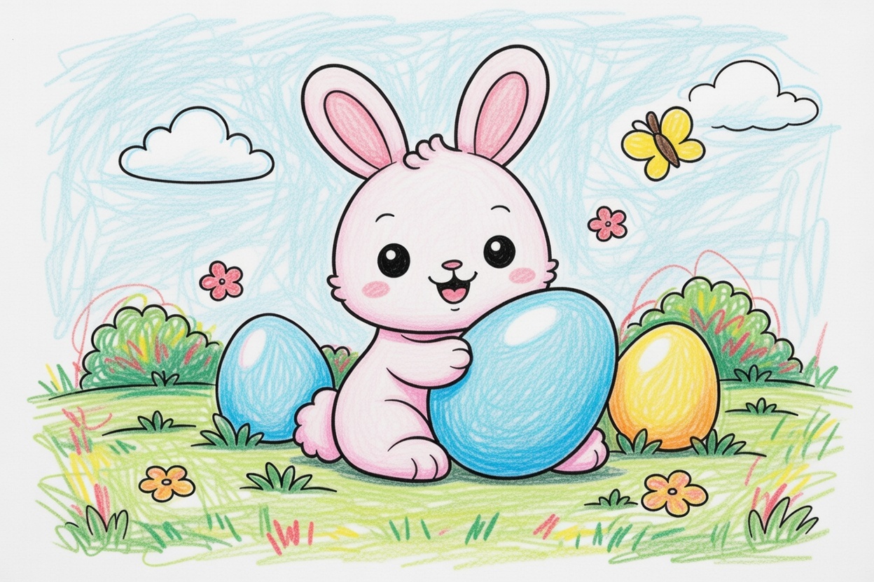 A happy bunny sits on the grass and hugs a big Easter egg. Clean lines, large shapes, and a simple background make this coloring page perfect for ages 1–5 and easy, joyful spring coloring.