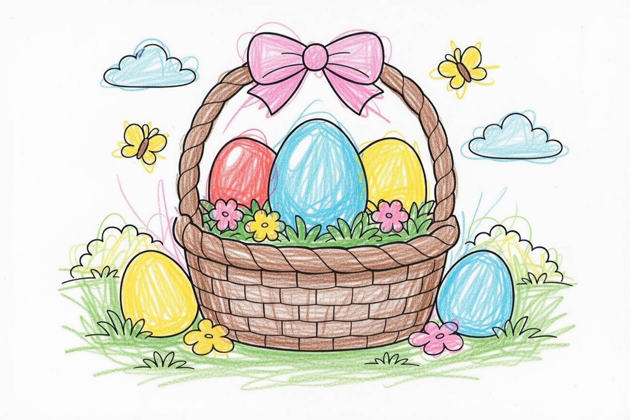 A simple basket filled with big Easter eggs sits on the grass. Clean lines, large shapes, and no patterns or shadows make this coloring page perfect for ages 1–5 and easy, calm spring coloring.