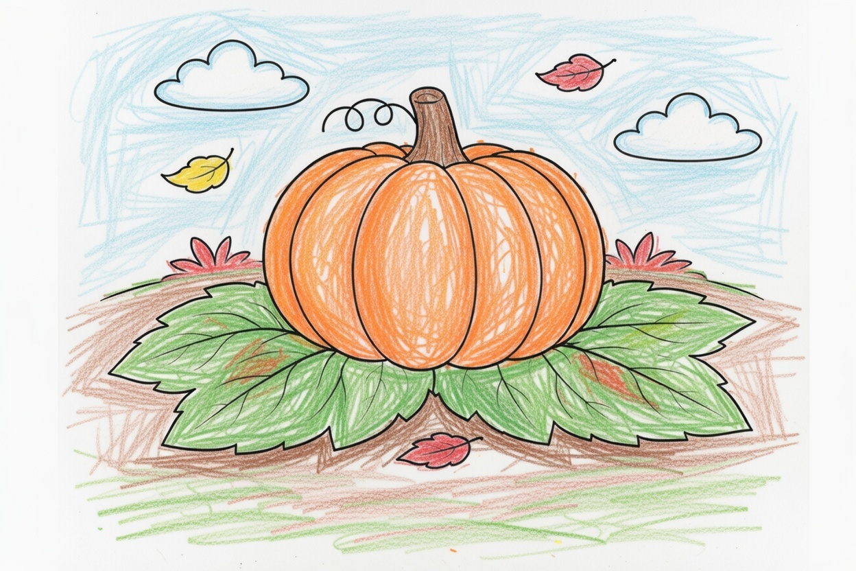 A big round pumpkin lies on two large autumn leaves, with a few simple clouds and falling leaves in the background. Clean lines, large shapes, no patterns or shadows make this coloring page perfect for children ages 1–5.