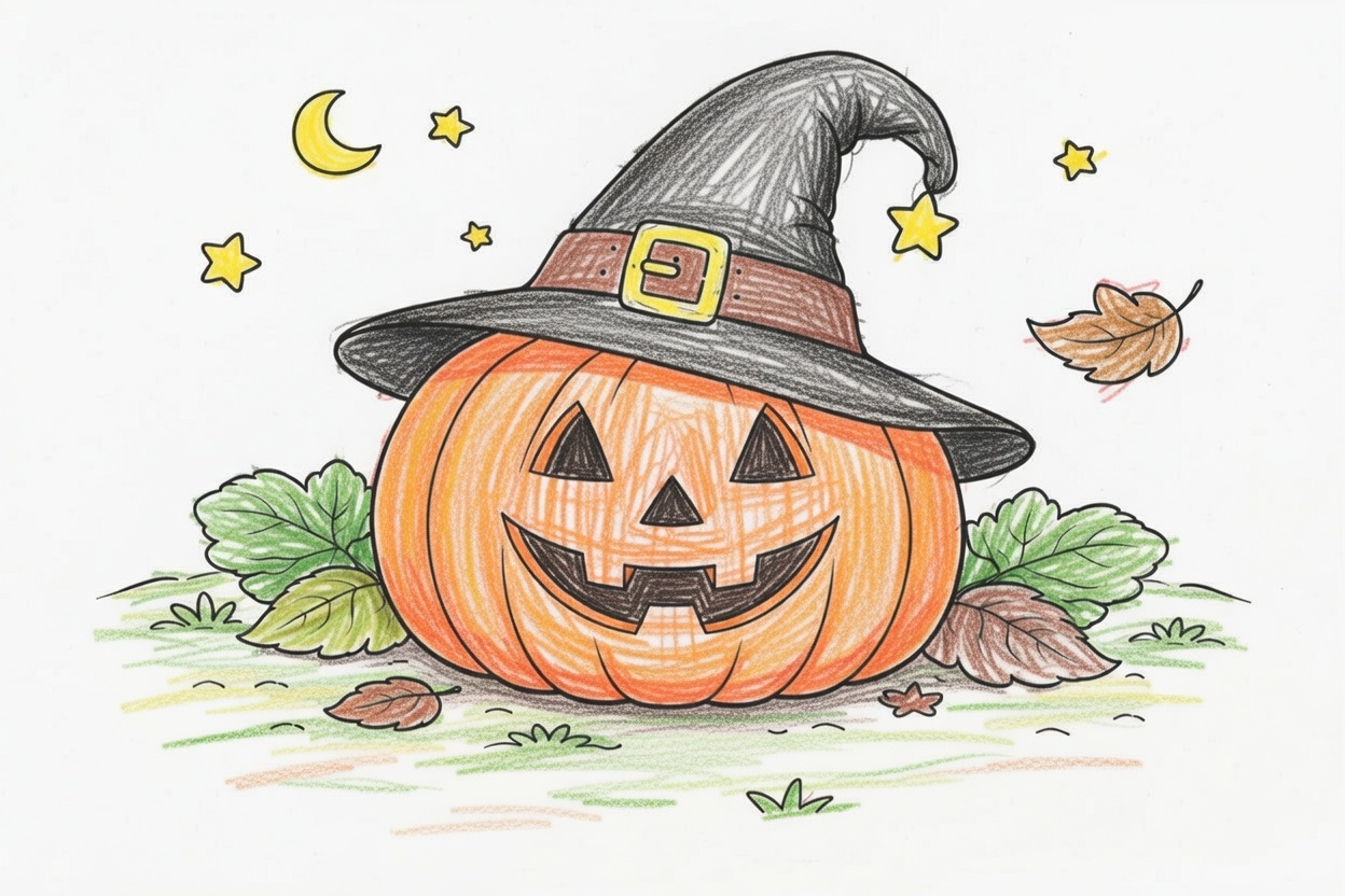 A big pumpkin wears a fun Halloween hat and smiles happily. Large shapes, clean bold lines, and no patterns or shadows make this coloring page perfect for ages 1–5 and friendly Halloween coloring.