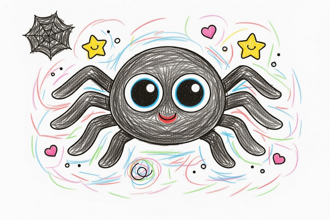 A cute friendly spider with a round body and big eyes smiles happily. Simple legs and a few small background elements make this coloring page calm, fun, and easy for children ages 1–5.
