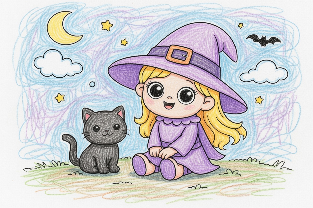 A little friendly witch sits on the ground with her cute cat by her side. Large shapes, clean lines, and a simple Halloween background make this coloring page perfect for children ages 1–5.