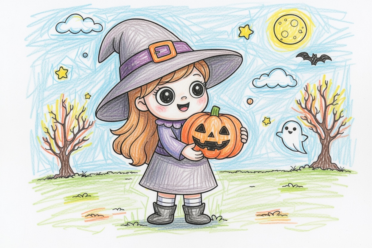 A friendly little witch holds a big smiling pumpkin while standing under a cloudy Halloween sky. Large shapes, clean lines, and a simple, unified background make this coloring page perfect for children ages 1–5.