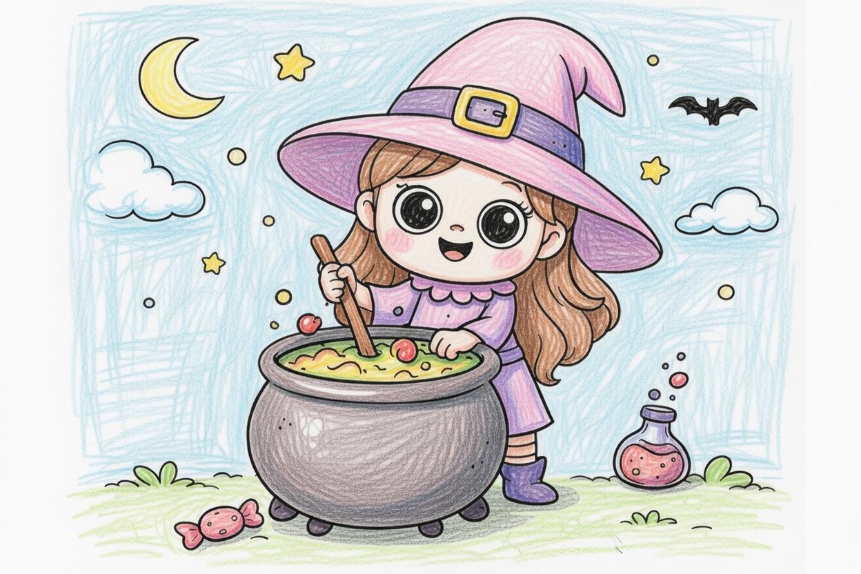 A friendly witch stirs a big cauldron with a smile. Simple shapes, clean lines, and a light Halloween background make this coloring page perfect for ages 1–5 and fun, not-scary coloring.
