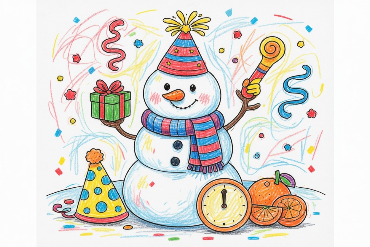 A happy snowman celebrates the New Year with a party hat and scarf. He holds a small gift, and oranges lie nearby. This simple black-and-white coloring page uses large, clear shapes, perfect for kids ages 1–5.