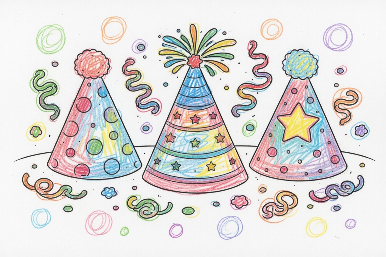Three fun party hats ready for a New Year celebration! This simple black-and-white coloring page features large shapes and light patterns, making it easy and enjoyable for kids ages 1–5 to color.