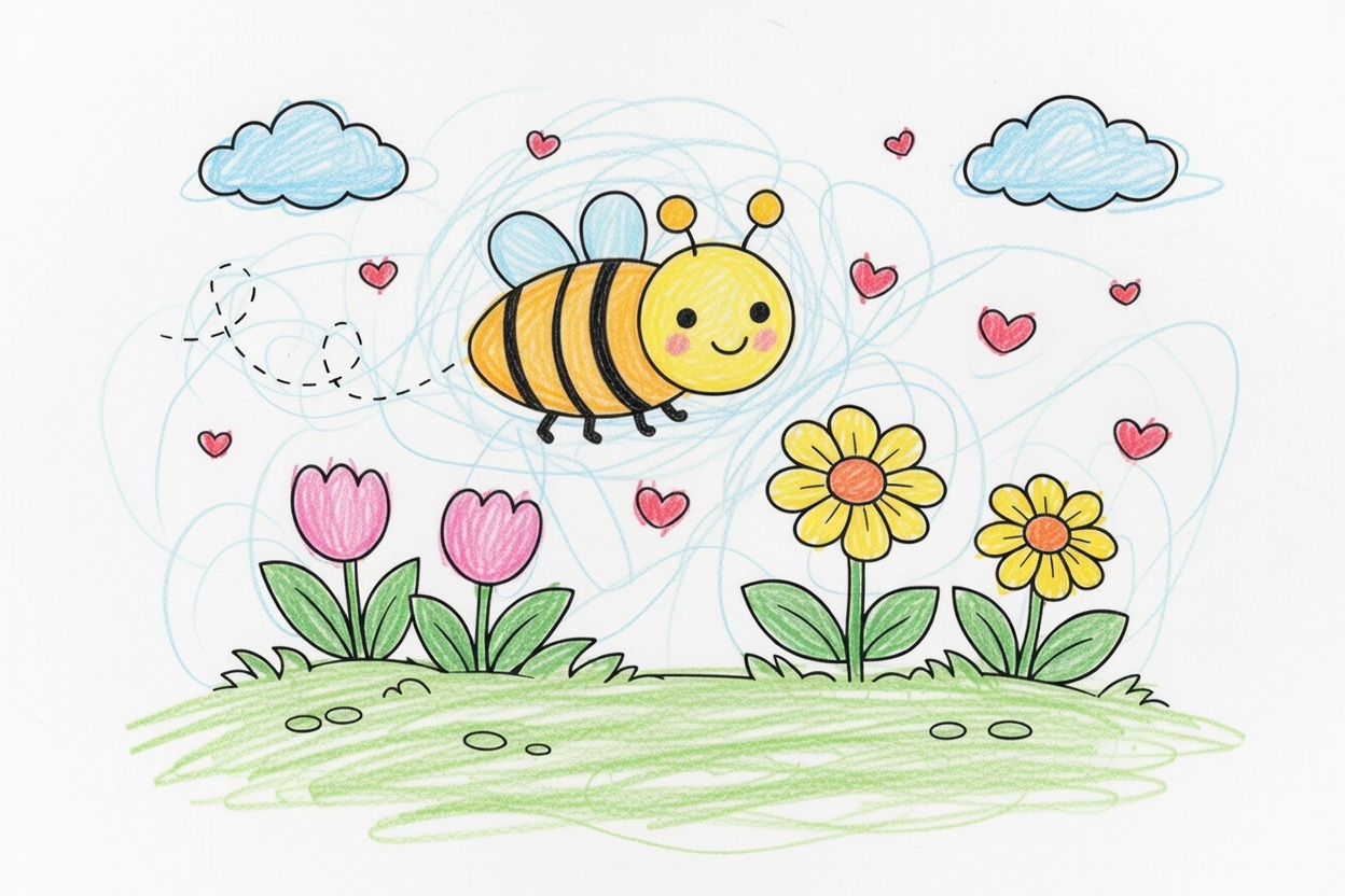 A happy bee flies near spring flowers in a sunny garden. This simple black-and-white coloring page uses big shapes and clean lines, making it easy and fun for kids ages 1–5 to color and enjoy spring.