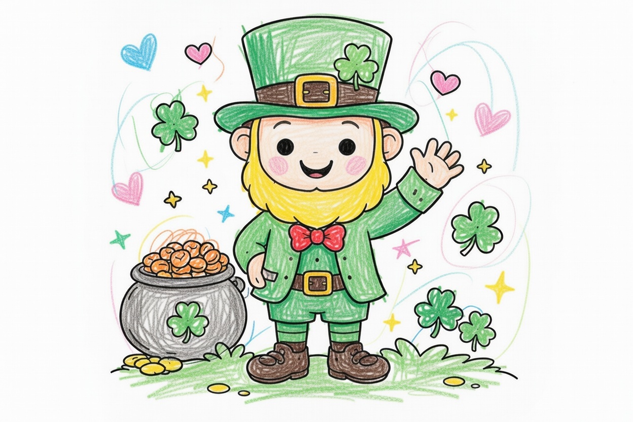 A friendly leprechaun smiles and waves hello. This simple black-and-white coloring page uses large shapes and clear outlines, making it easy and fun for kids ages 1–5 to color for St. Patrick’s Day.