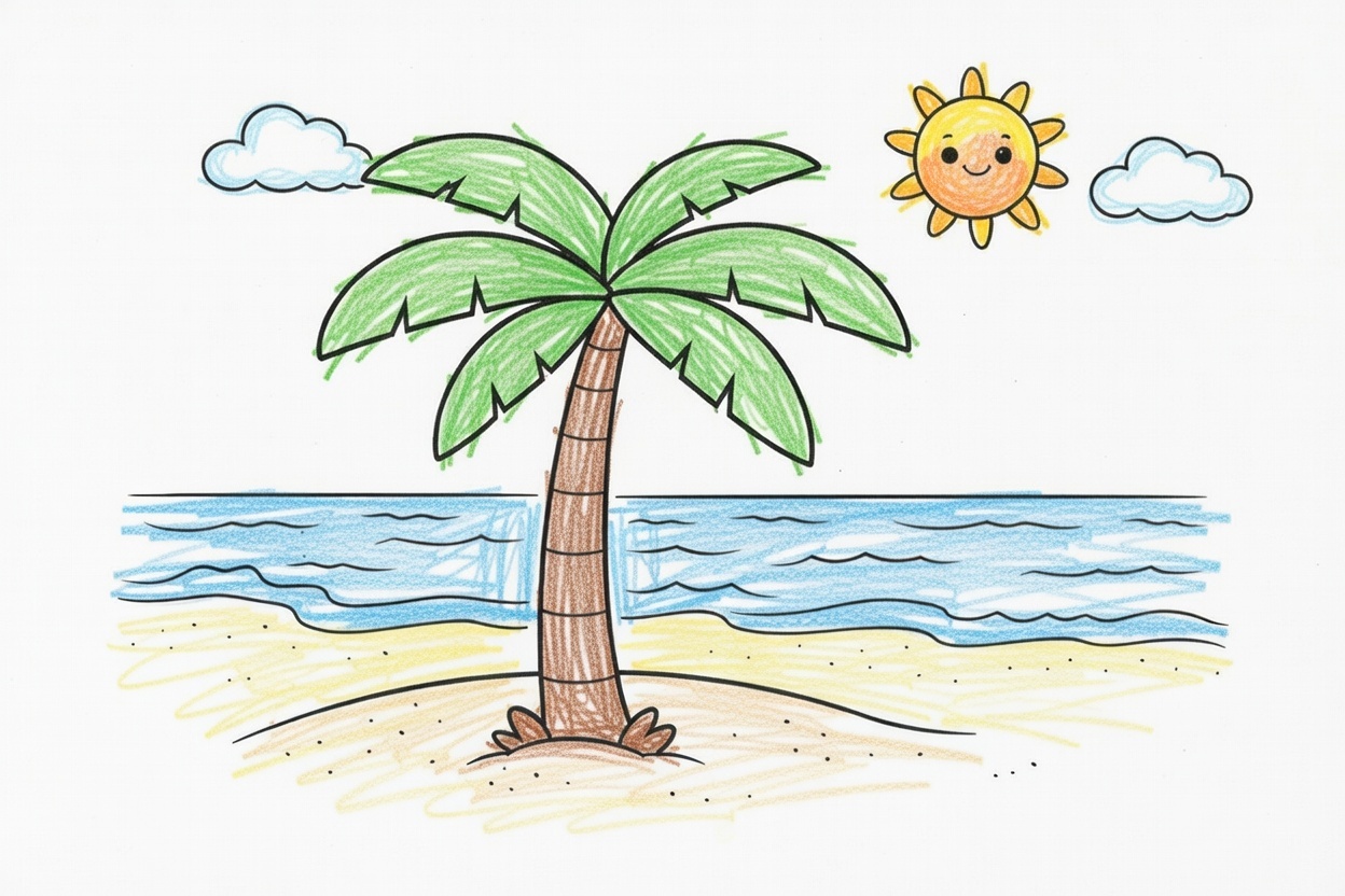 A single palm tree stands on the sandy beach with the sea behind it. A small sun and a couple of soft clouds appear in the sky. Large leaves and clean lines make this summer coloring page simple and relaxing for young children.