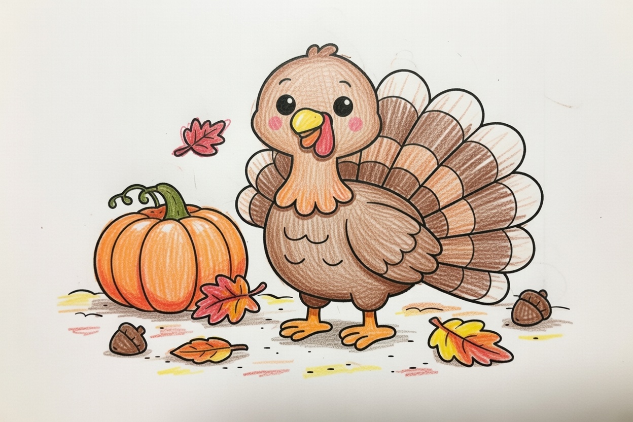 A happy turkey stands proudly with a friendly smile. Large shapes and clean lines create a warm Thanksgiving scene that is simple and fun for young children to color and enjoy.