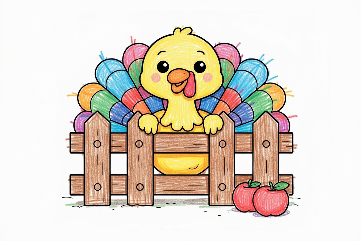 A friendly turkey peeks out from behind a simple fence and looks straight ahead. Large shapes and clean lines make this Thanksgiving coloring page clear, calm, and easy for young children to color.