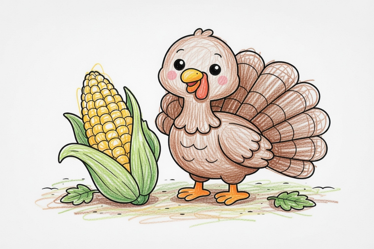 A friendly turkey stands next to a big ear of corn. Large shapes and clean lines create a simple Thanksgiving scene that is easy and fun for young children to color.