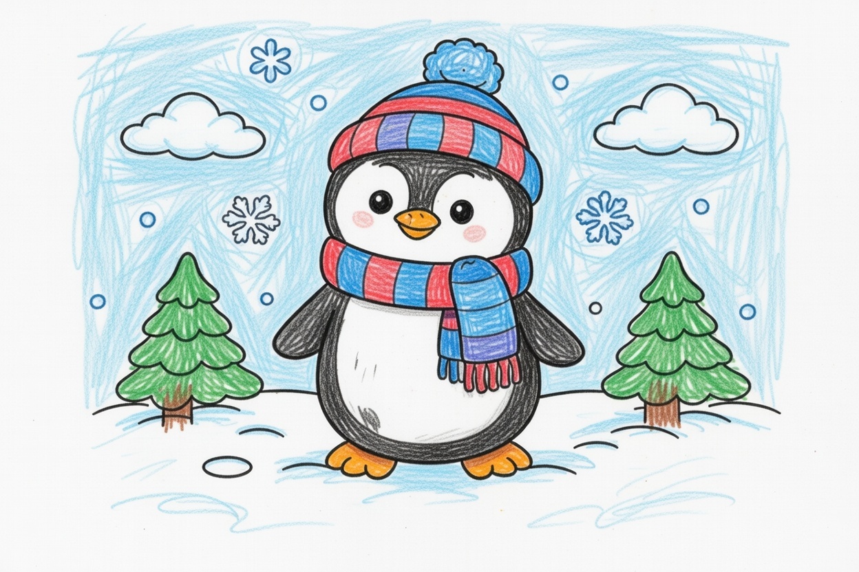 A friendly penguin stands in the snow wearing a warm hat and scarf. This simple black-and-white coloring page uses big shapes and clean lines, making it easy and fun for kids ages 1–5 to color.