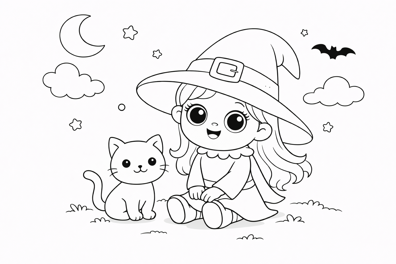 - Playful Halloween coloring pages – without frightening elements, but with pumpkins, bats, and friendly ghosts;