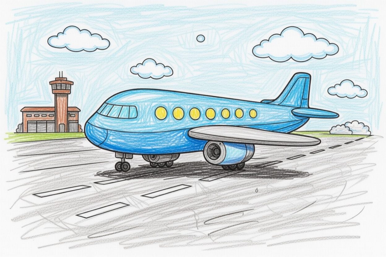 A big airplane stands on the runway, ready to fly. This simple black-and-white coloring page uses large shapes and clear outlines, making it easy and fun for kids ages 1–5 to color and learn about transport.
