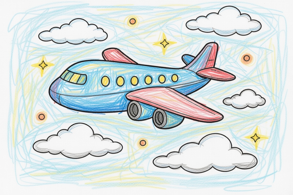 A big airplane flies high in the sky among soft clouds. This simple black-and-white coloring page uses large shapes and clear outlines, making it easy and fun for kids ages 1–5 to color and explore transport.